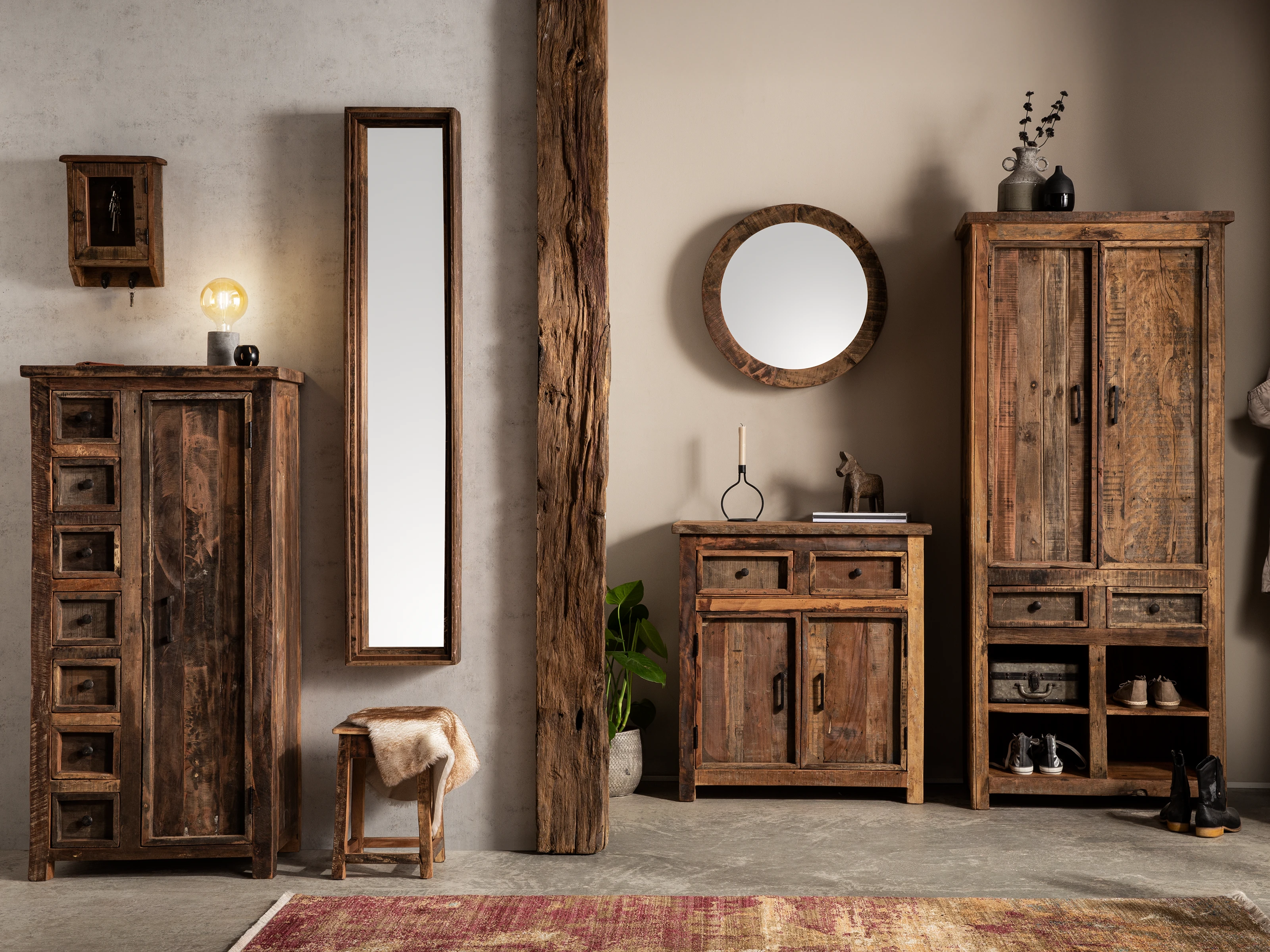 Sumatra – der Landhaus-Style, der Geschichten erzählt! Aus 100 % recyceltem Holz gefertigt, bringt die Serie rustikalen Charme in deine vier Wände. Natürliche Scharten, Risse und Kerben machen jedes Stück zum Unikat mit Charakter. Ob im Bad, Wohnzimmer oder Flur – Sumatra passt überall rein. Kombiniere die Möbel und hol dir echten Farmer-Style nach Hause – nachhaltig, stylisch, unverwechselbar!